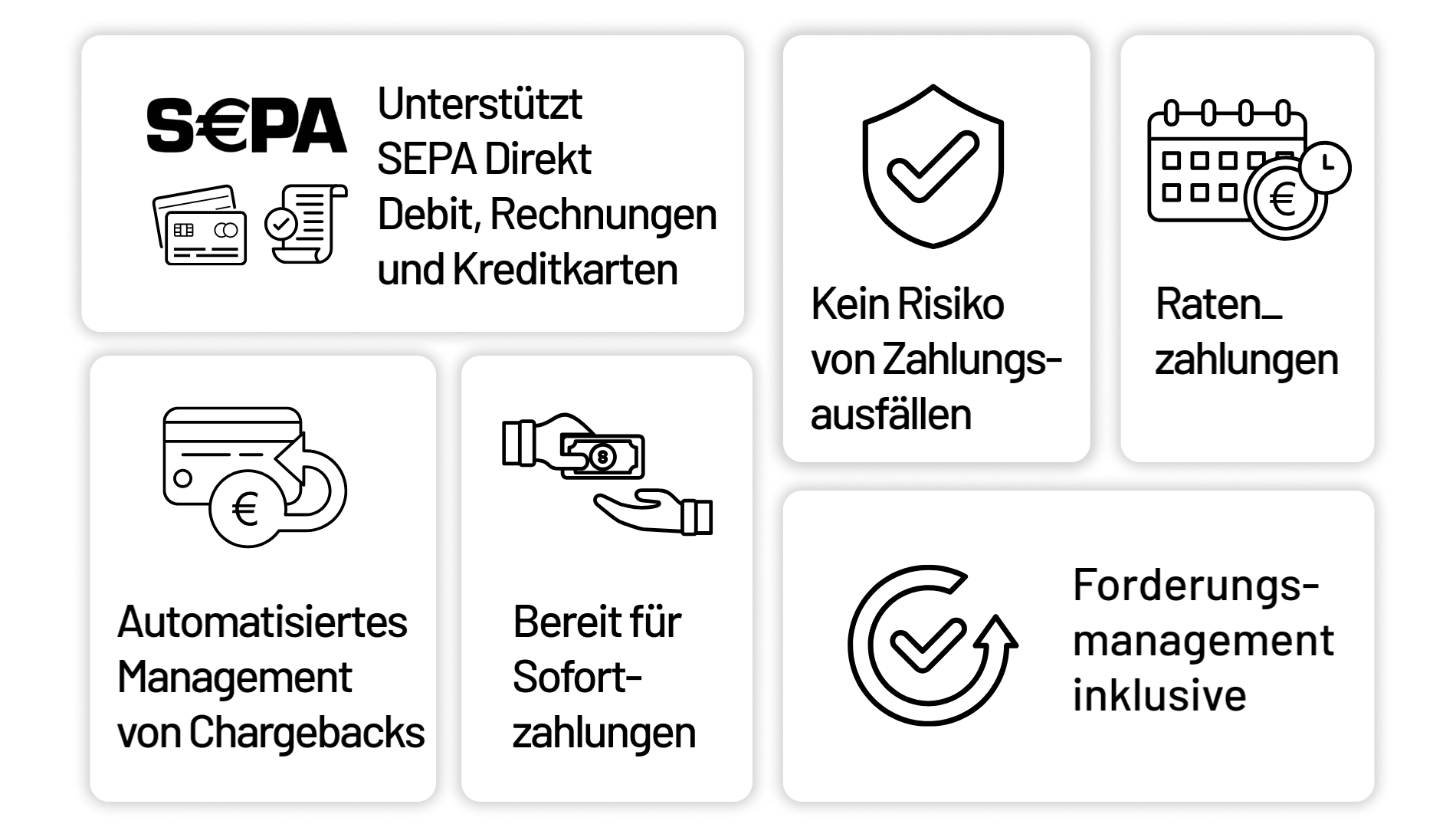 - Sofortige Auszahlungen: Sie erhalten Ihr Geld immer pünktlich, unabhängig vom Zahlungsstatus oder -verhalten des Endkunden.