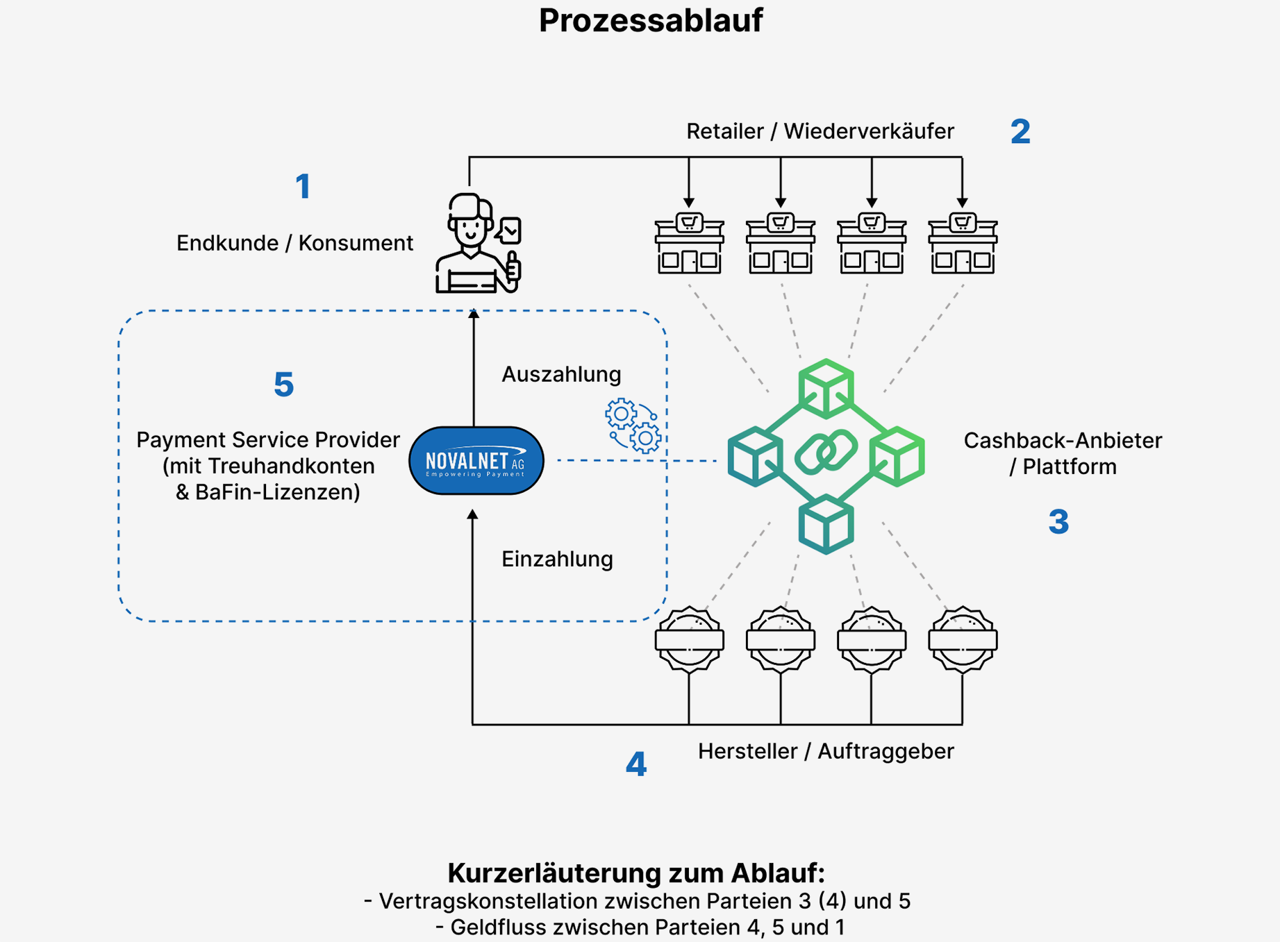 Anbieter von Cashback-, Bonus- und Loyalty-Programmen müssen laut Bundesanstalt für Finanzdienstleistungsaufsicht (BaFin) im Bereich des Zahlungsverkehrs rechtskonform sein. Der Eingang von Geldern Dritter (wie etwa Herstellern) auf die eigenen Konten des Cashback-Anbieters und die Auszahlung dieser Gelder vom Cashback-Anbieter an den jeweiligen Verbraucher sind nur mit den entsprechenden BaFin-Lizenzen zulässig (ZAG § 1 Abs. 2 Nr. 6). Novalnet bietet als BaFin-lizensiertes Zahlungsinstitut die rechtssichere und rechtskonforme Abwicklung aller Finanztransaktionen für solche Geschäftsmodelle sowie insolvenz- und pfändungssichere Treuhandkonten an.